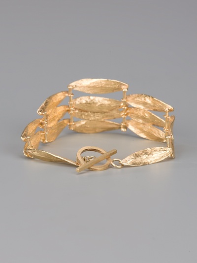 This gold bracelet is made up of gold leaves. It has four gold leaves side by side at its widest width and tapers to three, then two then a single leaf at the closure. This bracelet has matching earrings.