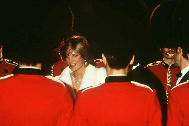 Princess Diana Wearing a Choker and Smiling Princess Diana attends a formal event in a dark blue velvet and lace dress. |