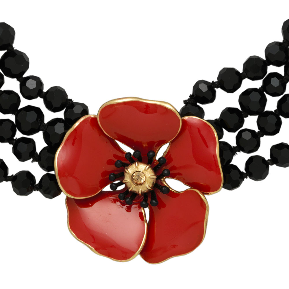 This poppy brooch is inlaid with red and black crystals and plated in 18K gold.