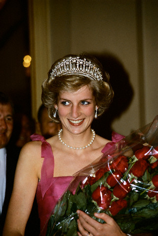 Princess Diana Holding Bouquet of Roses Princess Diana wears diamond and pearl tiara to a formal event. |