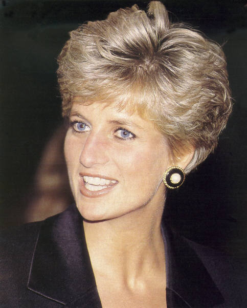 Princess Diana Smiling Princess Diana wears gold jewelry with her short haircut. |