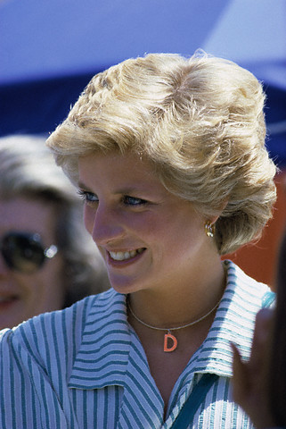 Princess Diana in "D" Necklace Princess Diana wears a "D" necklace to a polo match in Australia. |