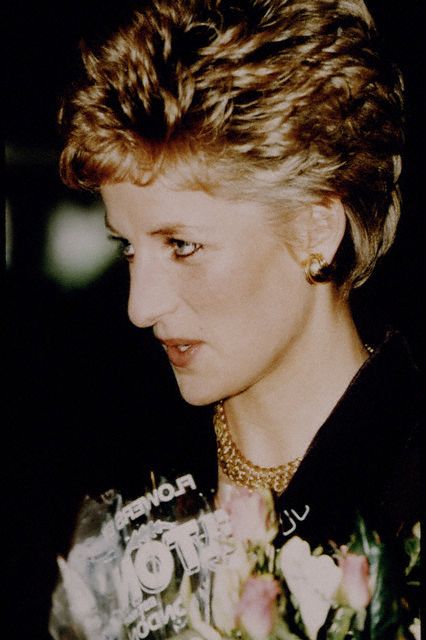 Princess Diana Smiling Princess Diana wears gold jewelry with her short haircut. |