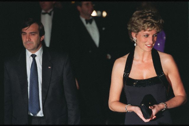 Princess Diana Wearing a Choker and Smiling Princess Diana attends a formal event in a dark blue velvet and lace dress. |