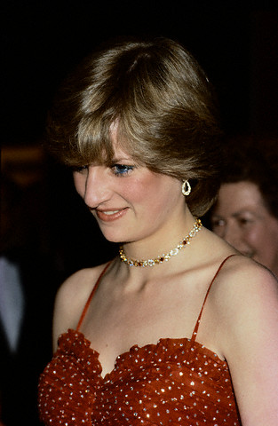 Princess Wearing Red Evening Gown Princess Diana wears Spencer family tiara, Prince of Wales Feathers necklace, and family order of Queen Elizabeth pin. |